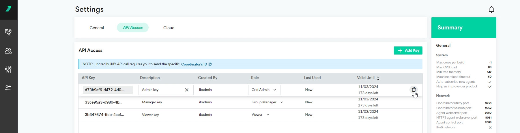 ゴミ箱アイコンをクリックしてAPIキーを削除できます。