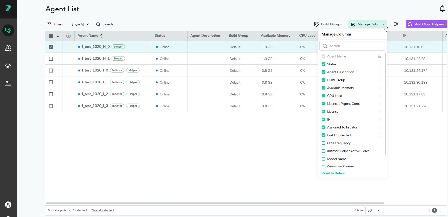 Agentリストには、各Agentのステータス、使用可能なCPU、説明などの情報が表示されます。列の管理 をクリックして、リストに列を追加または削除します。検索欄に文字列を入力することで、オプションのリストを絞り込めます。