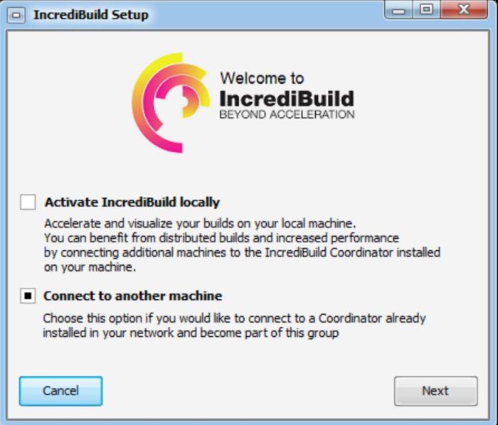 注意:ローカルでIncredibuildをアクティベートするか、他のマシンに接続してアクティベートするか、選択することができます。別のマシンに接続する」インストールを使用する すでにCoordinatorがインストールされている場合。それ以外の場合は、「Incredibuildをローカルでアクティベートする 」を使用します。