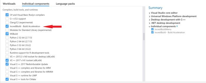 Visual Studioコンポーネントのインストール時に、「Incredibuild - Build Acceleration」のチェックボックスにチェックを入れ、通常通りインストールを続けてください。
