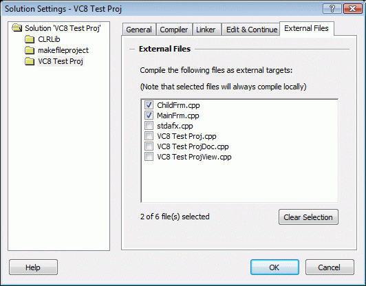 このタブでは、分散せずに標準的な Visual C++ の手順でコンパイルするファイルを指定します。主にトラブルシューティングで使用します。