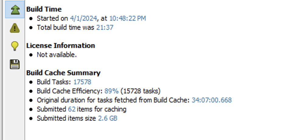 Build Cacheのヒット/ミスの詳細レポートには、各タスクに関する広範な情報が表示されキャッシュが、ヒットしたのか、また、ミスをしたのか、もし、ミスをした場合はその理由が表示されます。詳細は、Build Cache - Monitoring and Diagnosing Efficiency を参照してください。