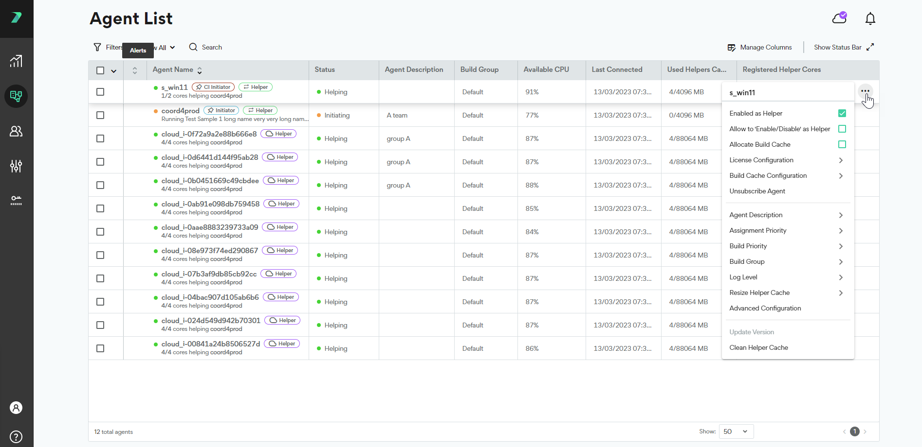 Coordinator Manager のAgent List で、Build Group や Log Level などの設定を変更することができます。1つのエージェントを変更するには、3つのドットのメニューを使用するか、任意のエージェントを右クリックします。