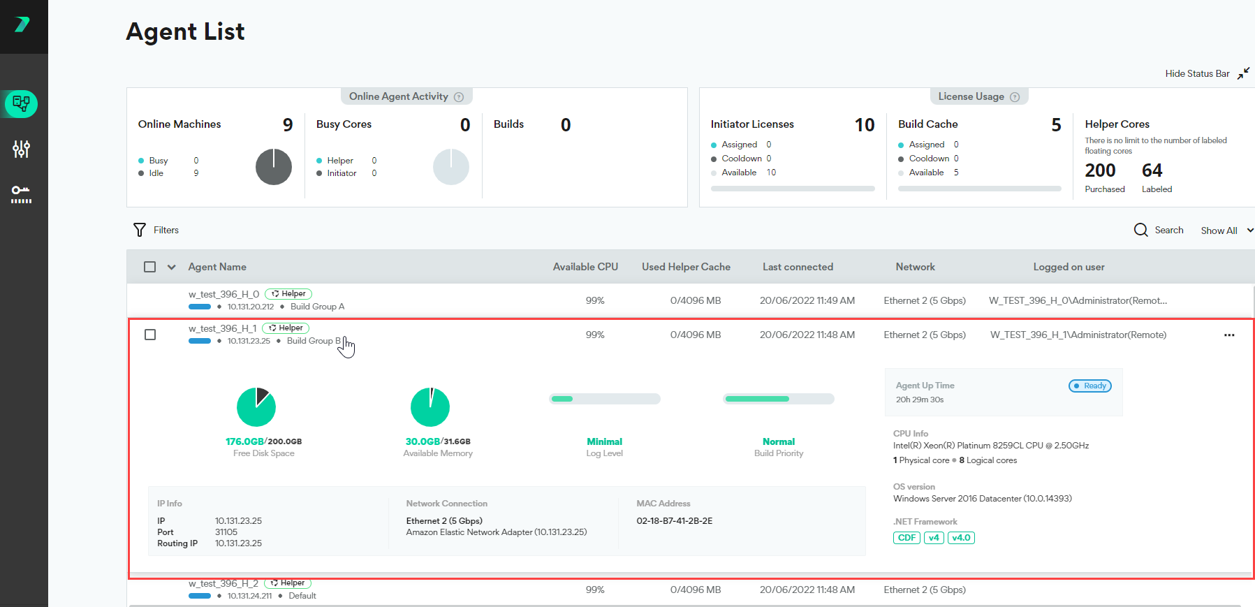 エージェントリストには、各エージェントのIPアドレス、ステータス、現在利用可能なCPUコアの数などの情報が表示されます。Agentをクリックすると、詳細情報が表示されます。