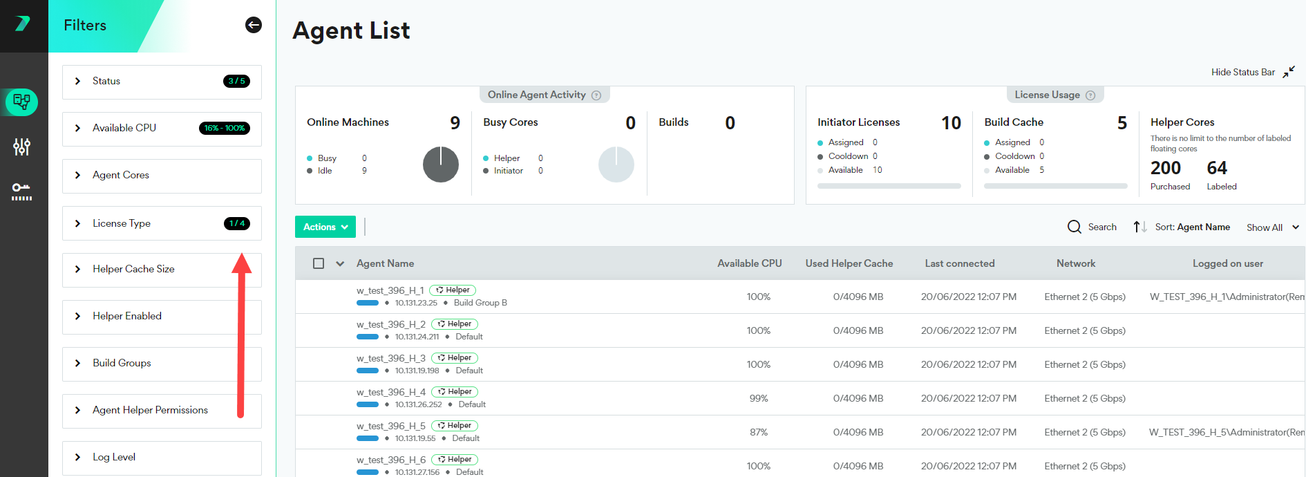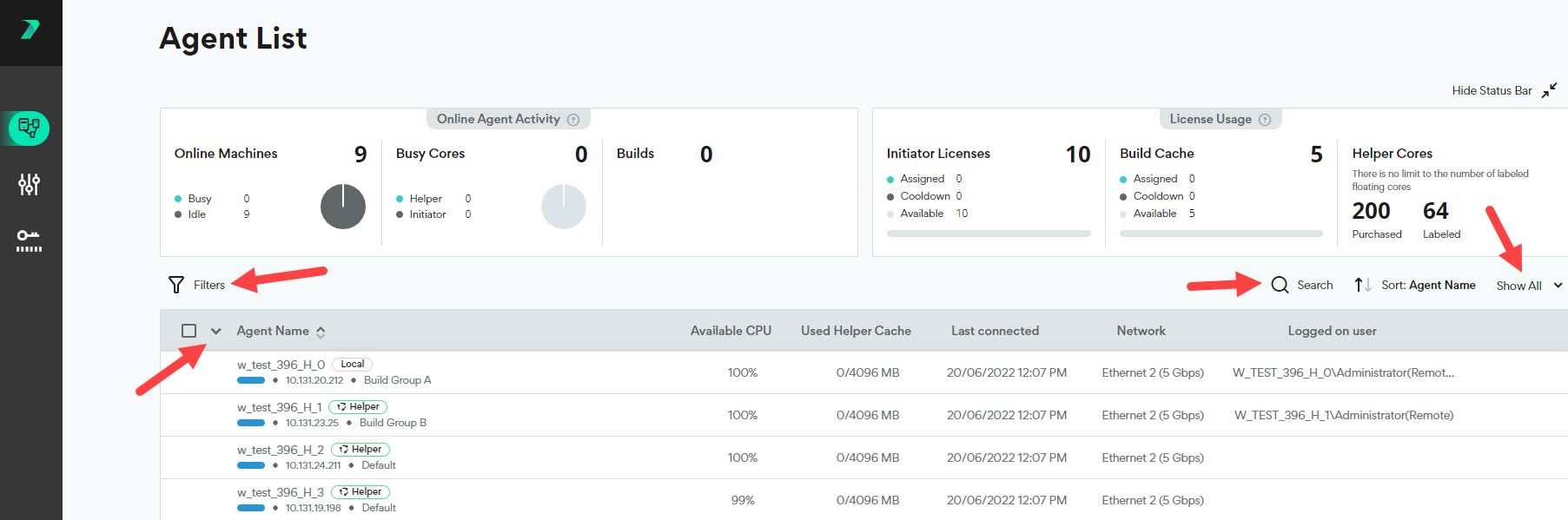 エージェントリストは、検索バーに入力する、クイックフィルターのドロップダウンを使用する、もしくは、フィルターボタンを使用することでフィルタリングすることができます。検索バーでは、以下の属性をスキャンします。Agent名、Build Group、IP、ルーティングIP、Macアドレス、現在のビルドタイトルを検索します。