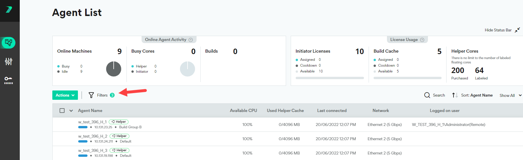 フィルターボタンは、ステータスや利用可能なCPUなどの項目に基づいて、エージェントのリストをフィルタリングすることができます。右側の黒いラベルのついたフィルターは、現在どの項目がフィルターされているかを示しています。