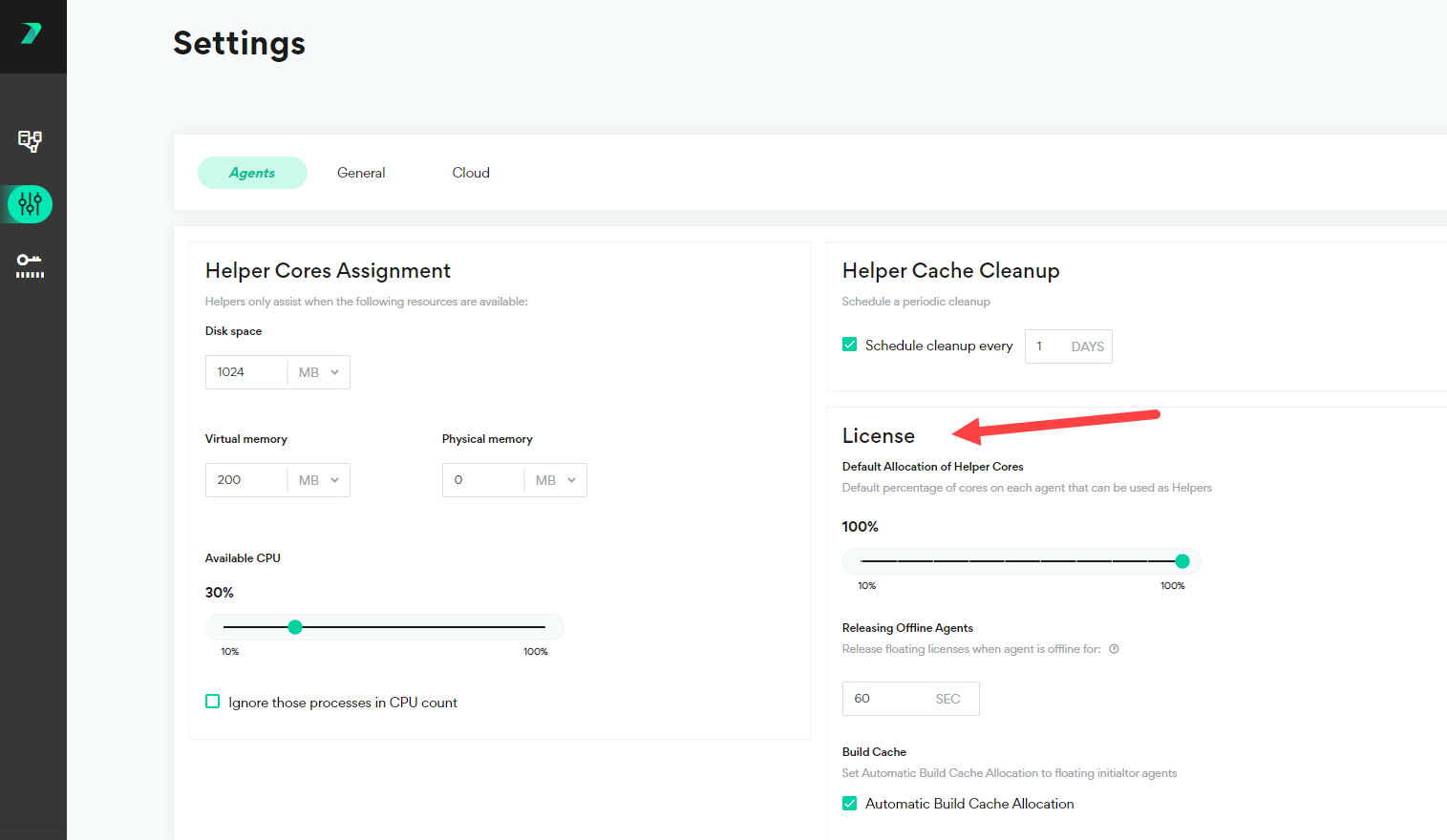 Coordinator >Settings>Agent エリアでは、オフラインライセンスのタイムアウトやマシンごとのヘルパーコアの最大数など、一般的なライセンス設定をすべて管理することができます。詳しくは、Coordinator Settings をご覧ください。