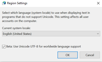 グルーバル言語サポートで Unicode UTF-8 を使用するWindows言語設定をにチェックを入れてください。これは Coordinator とエージェントマシンで行う必要があります。