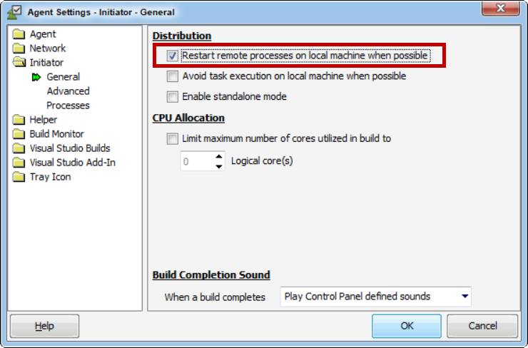 Initiator Agent の場合: [Agent Settings] を開き、[Initiator] > [General] に移動して[Limit maximum number of cores used in build to] の数を調整します。