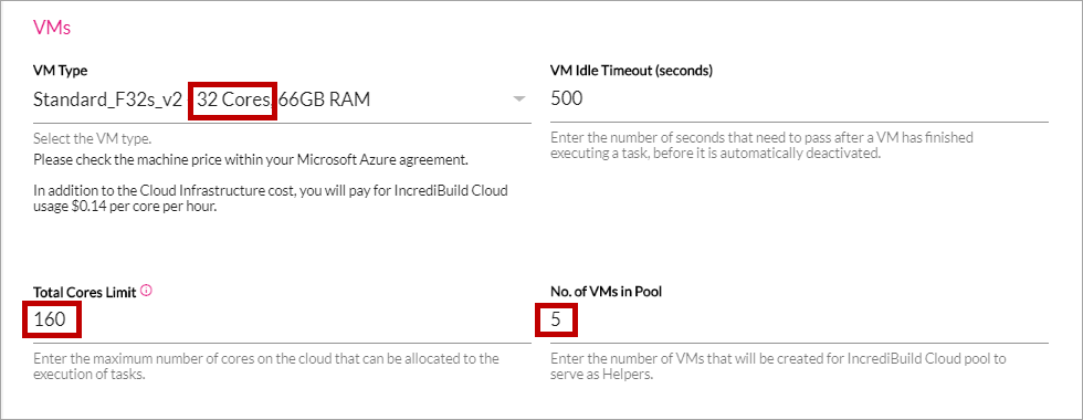 Incredibuild Cloud ソリューションを使用する場合は、キャッシュの損失を回避するために、プールサイズが、タスクの高速化に使用するすべてのHelperVM を含めるのに十分な大きさであることを確認してください。Incredibuild Cloud ソリューションの 設定ページで、Total Cores Limitは、 Core数 × VM数Pool 内のに等しくなります。[Total Cores Limit] が高い値に設定されている場合は、VM は使用後にキャッシュが失われるので自宅での作業効率が低下します。この例では、160 コア (総コア数) = 32 コア X 5 VM となっています。