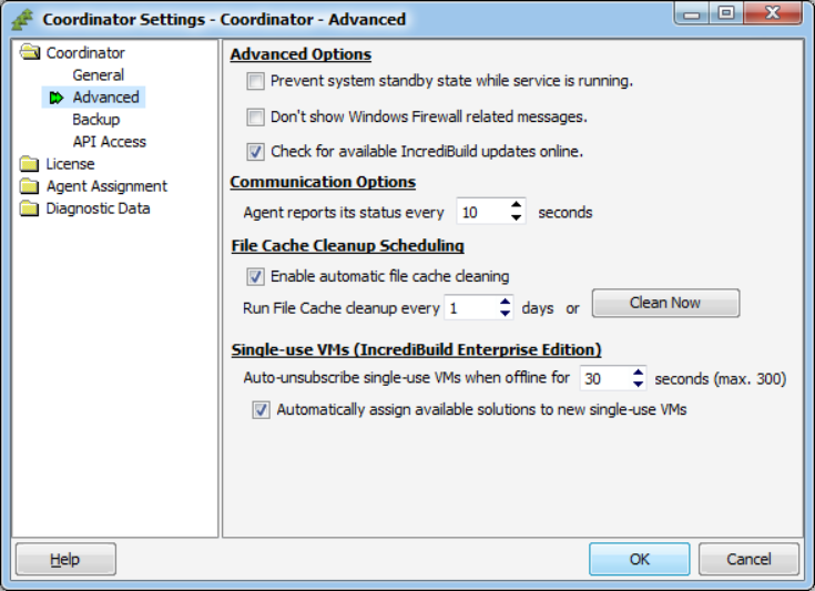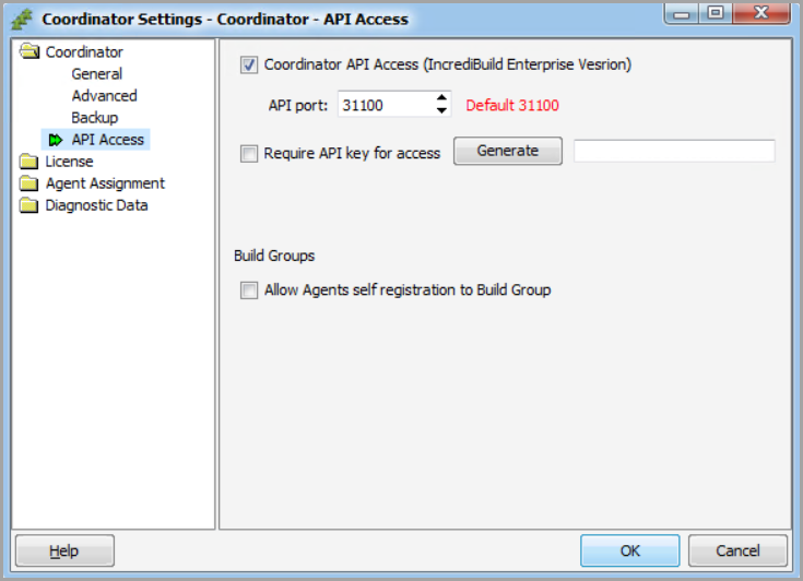 [エンタープライズ版のみ] このセクションでは Incredibuild 環境でビルド グループを管理するための追加オプションを設定します。このセクションの他のオプションとともに[Coordinator API Access] チェックボックスを選択すると、以下を実行することができます。