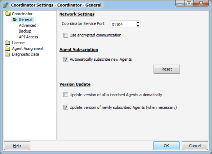 自動的にサブスクライブされた Agent (前述の [Automatically subscribe new Agents] の項を参照) がその時点で古いバージョンを実行している場合、Coordinator マシンのバージョンに更新します ([Update version of all subscribed Agents automatically] を有効にすると自動的に選択されます)。