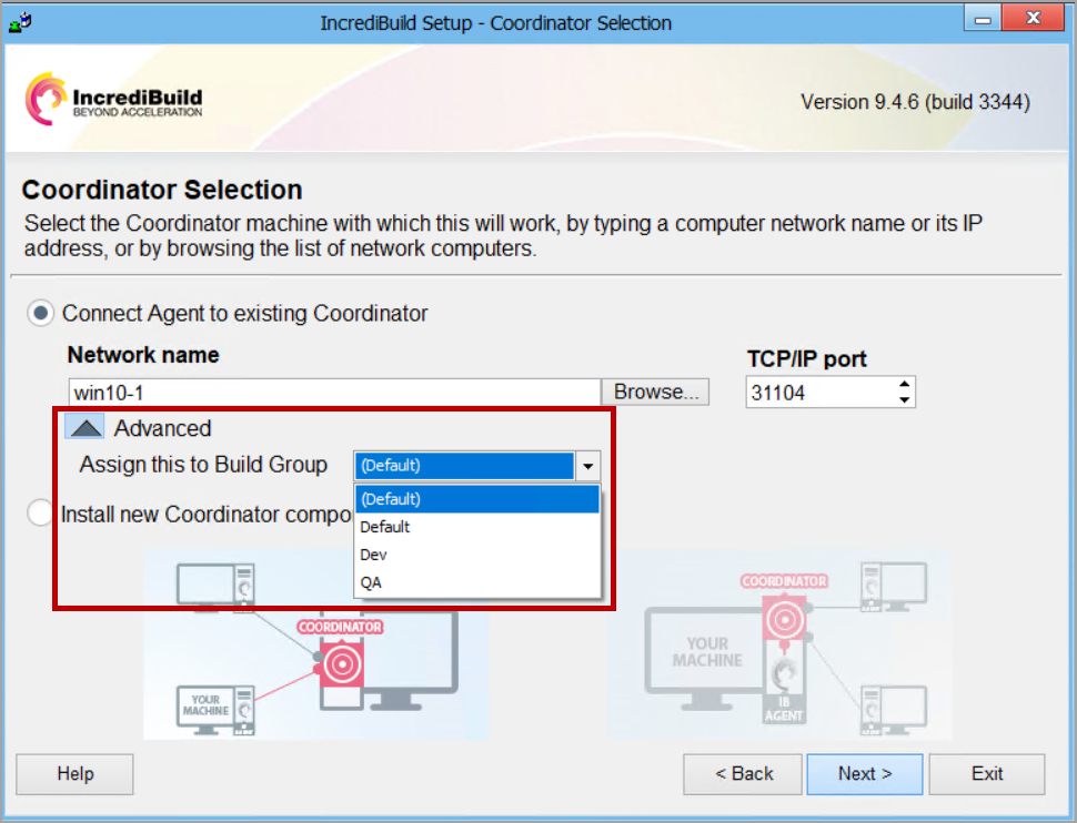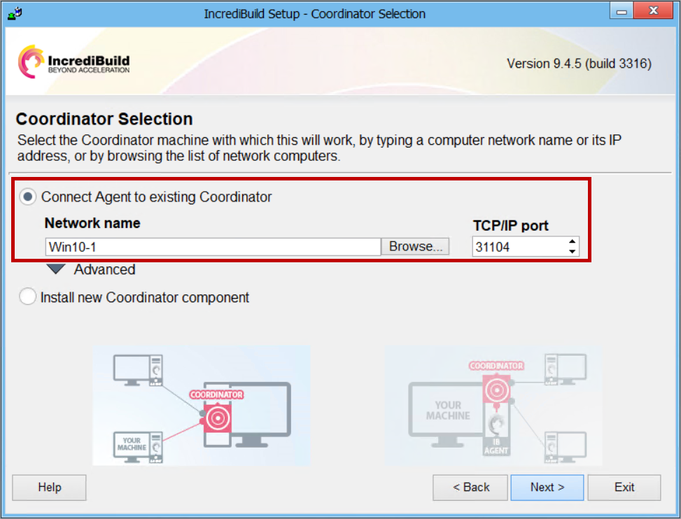 Connect Agent to existing Coordinator を選択し、[Network name]フィールドに Coordinator の IP アドレスまたはホストネームを入力します。