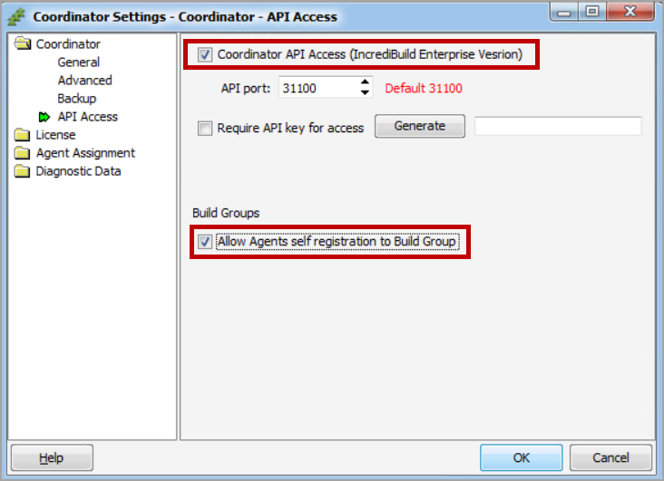 [Coordinator] > [Coordinator Settings]>[ Coordinator] >[ API Access]に進み、[Allow Agents self registration to Build Group] を選択します。