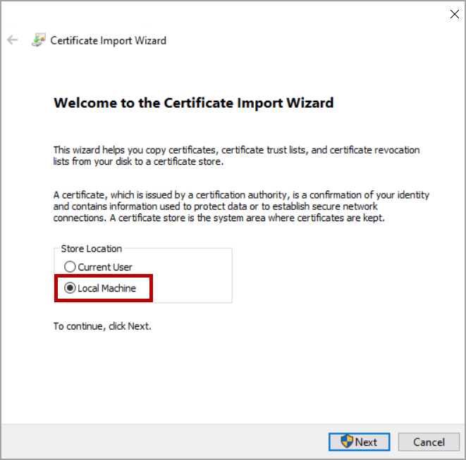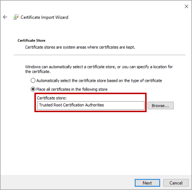 [Certificate store] 欄で「Trusted Root Certification Authorities」が選択されていることを確認して [Next] をクリックします。