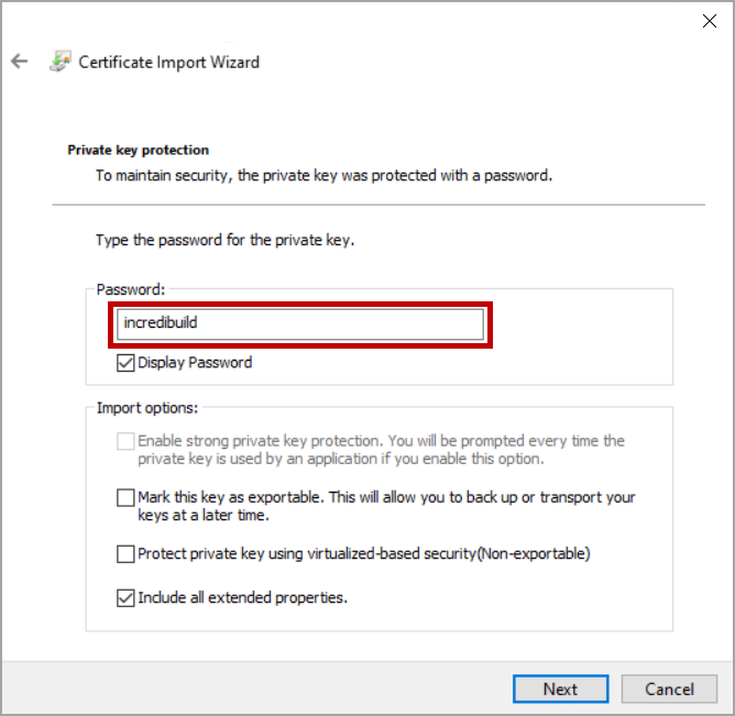 [Password] 欄に「Incredibuild」と入力して、[Next] をクリックします。