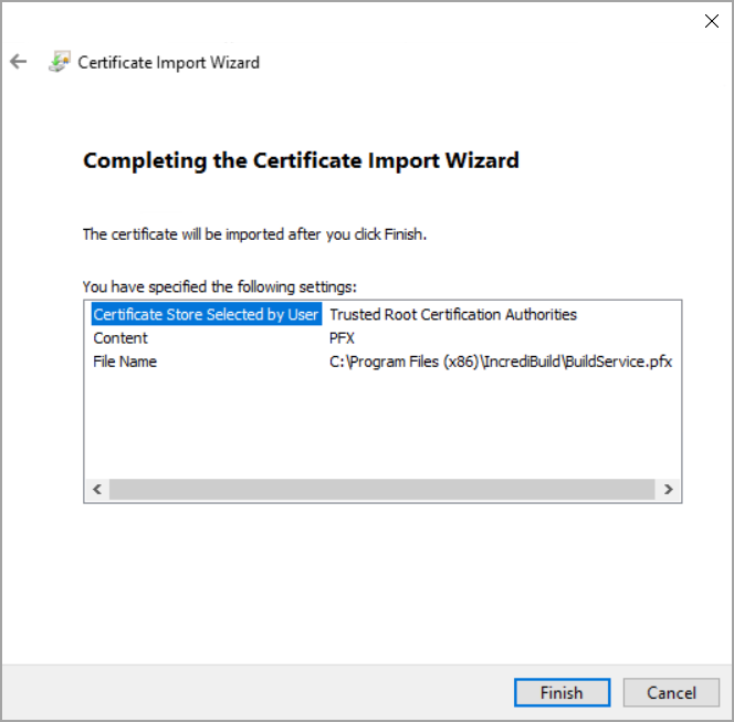 Coordinator マシンのファイル エクスプローラーで BuildService.pfx ファイル (install_dir\Incredibuild にあります) をダブルクリックします。