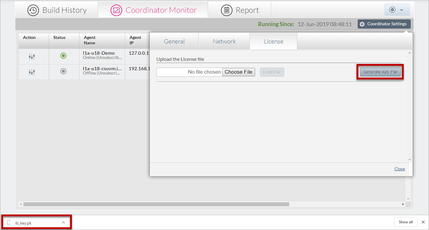 Go to the License tab and click Generate Key File. An ib_key.pk file is downloaded to your machine. Each subsequent click on the Generate Key File button will generate a new file, which invalidates any previously generated files. Make sure that you use the latest generated file.