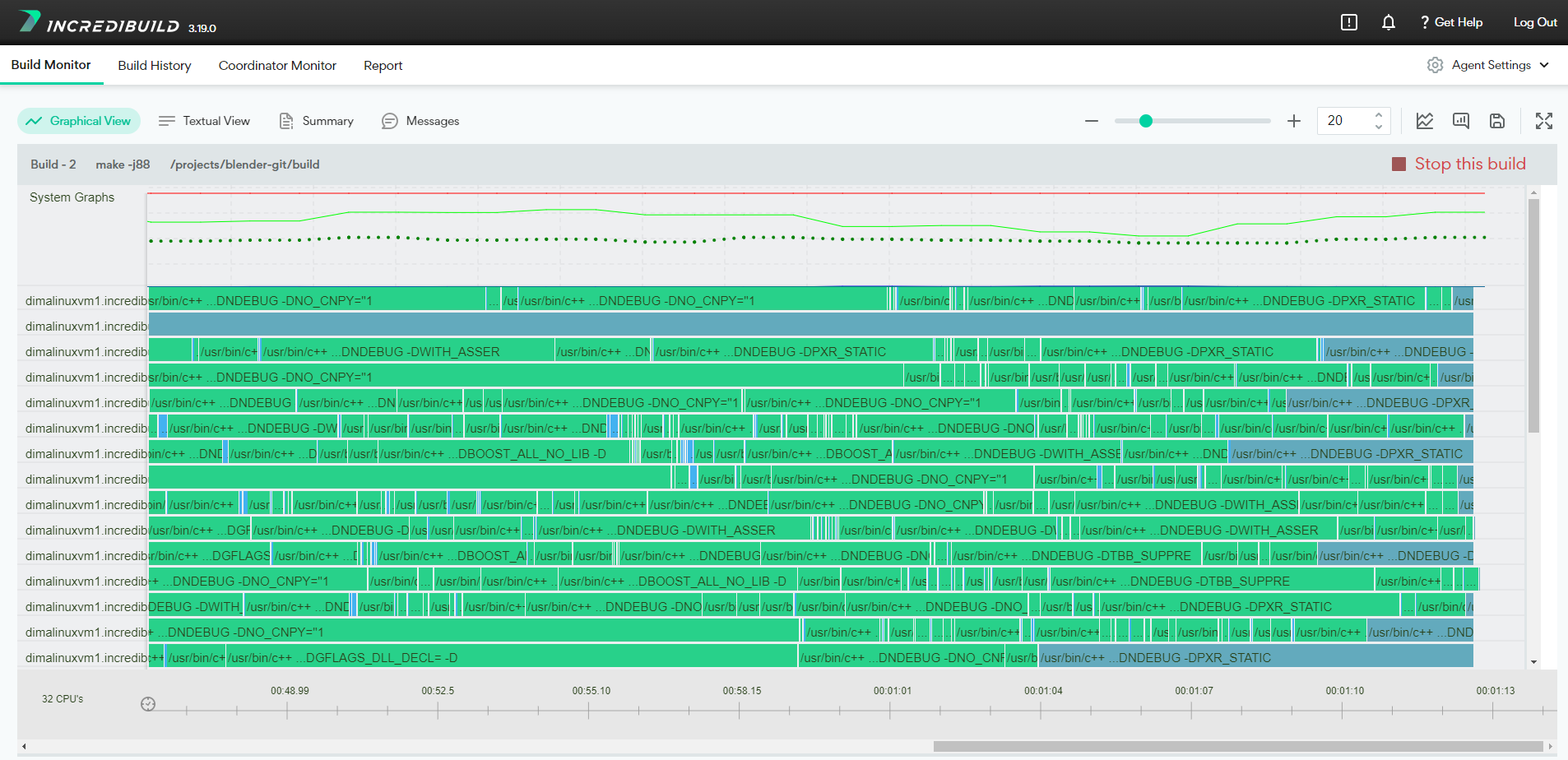 The System Graphs show overall information such as used memory and CPU load over time. Hovering over the System Graph shows the system information at any point of time during the build: