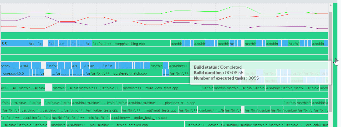 Each colored block represents a single task in the build. The various colors represent the various task statuses.