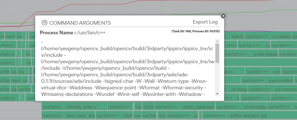 Clicking on a task block displays more detailed information such as the process name, command arguments, task ID, and any warnings or errors.
