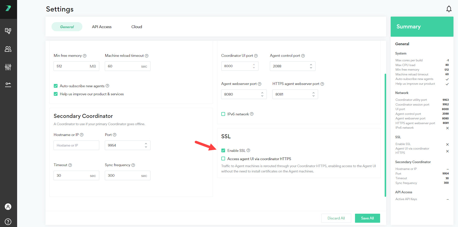 Go to the Coordinator Monitor > Settings > General tab and click Enable SSL: