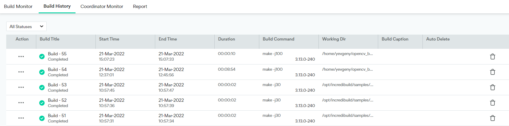 Icon by the build name represents the build's status: Pending, Running.., Completed, Aborted, Error or Warning