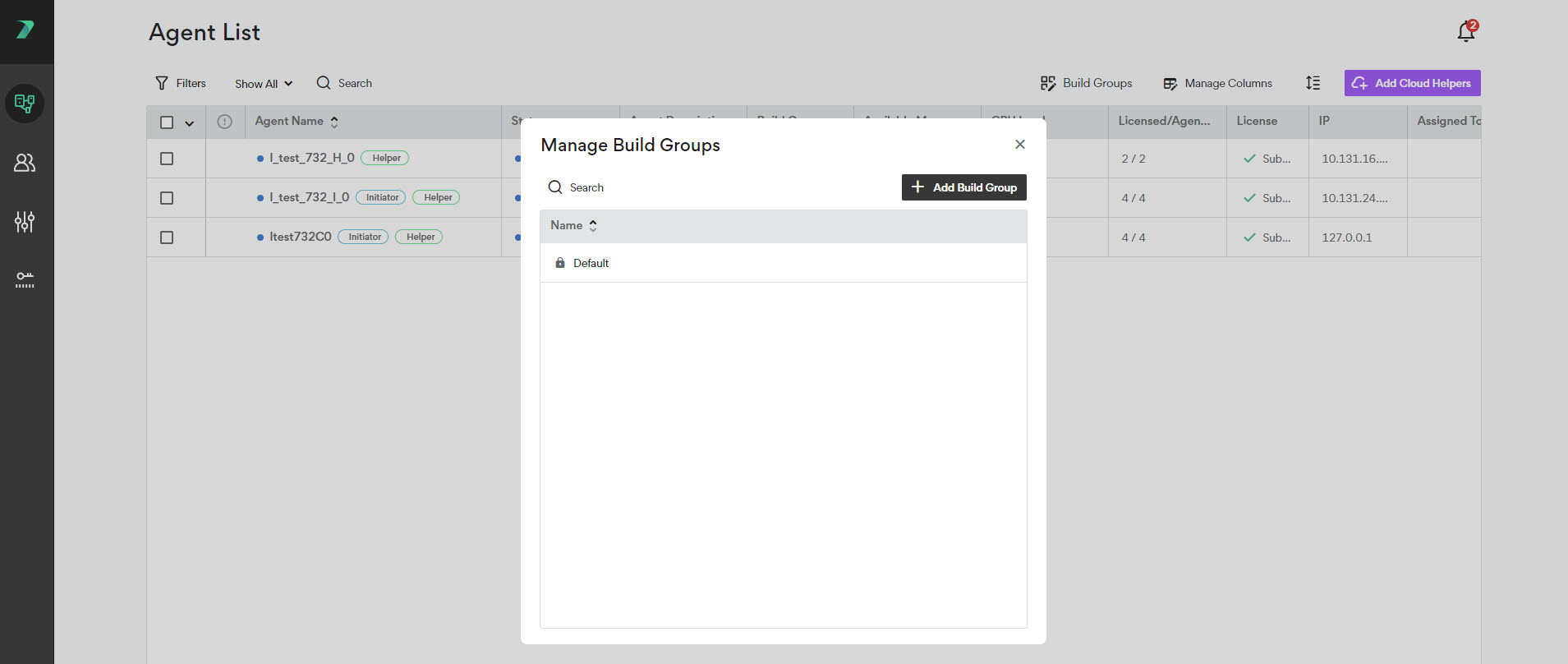 Build Groups allow you to limit build distribution to a select group of Agents. Each Build Group includes Initiator Agents and Helper Agents. By default, every Agent is assigned to the Default Build Group.
