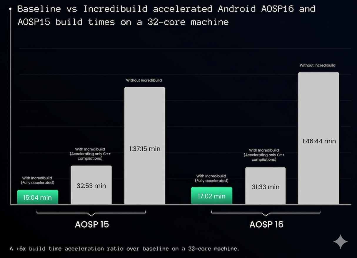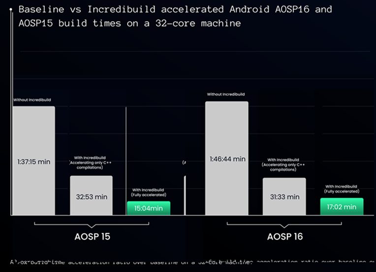 Incredibuild accelerates AOSP builds by combining Build Cache (reusing 90% of tasks) with distributed computing This reduces a typical AOSP build from nearly 2 hours to a quarter of an hour. Security is maintained as all source code remains fully resident on your local on-premises or private cloud network.
