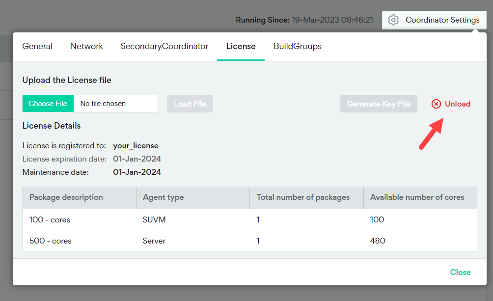 On Coordinator Settings dialog box, open the License tab. Then, Click the Unload option.