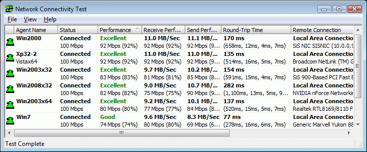 The Network Connectivity test can be used to locate network issues and bottlenecks. The tool sends test data to all Agents connected to the Coordinator, which in turn sends back the same data. Network performance for each Agent is recorded, with the test repeated four times to rule out random results.