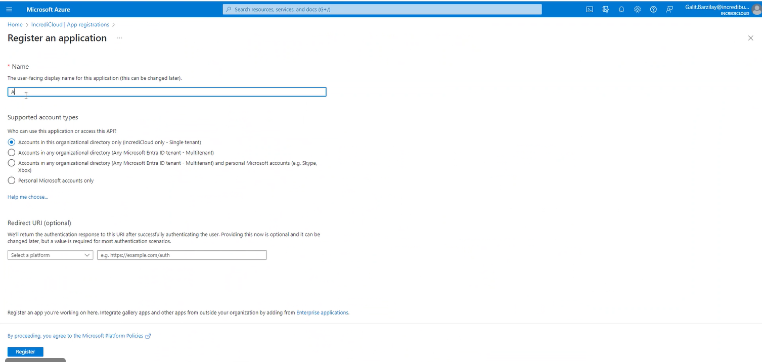 2. In the Redirect URI, select Web and enter https://localhost:8000/azureCallback.