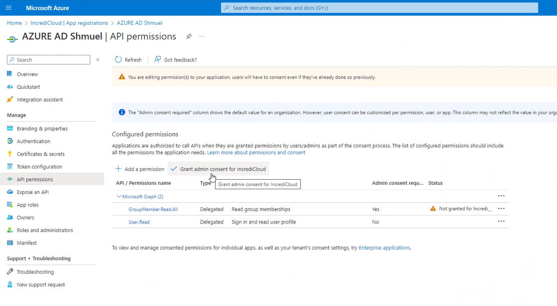 6. Click Grant admin consent for <your organization account>