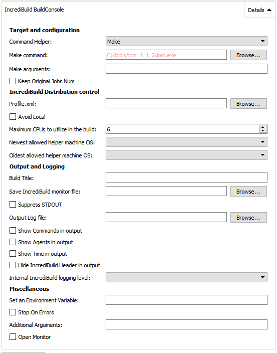 To manage how the plugin affects your builds, click Details and edit the settings. These settings differ for windows and linux. For details about each settings, see Incredibuild Plugin Settings below.