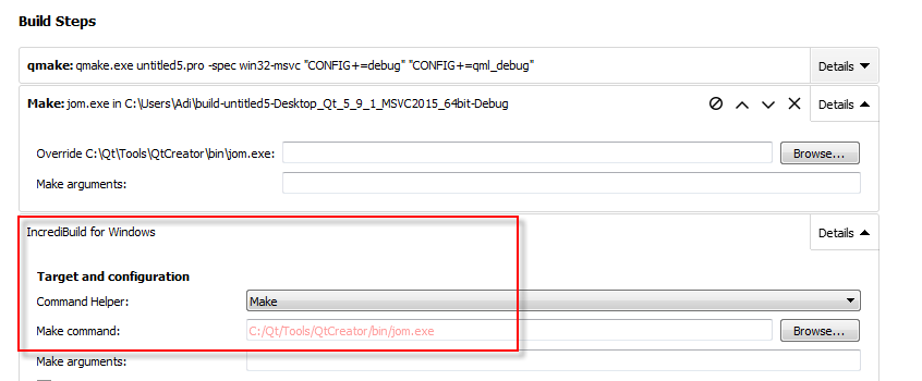 In this example, the user has defined a qmake command that creates the Make build tool defined in the following Make Build Step. -Upon Adding the Incredibuild Build Step, the Command Helper field automatically detects the Build tool being used in the previous Build step, which is Make in this case.. -If you look at the Make command field in "Incredibuild for Windows" you will see that it is set to a directory containing "jom.exe", as defined in the Make Build Step above it.![]()