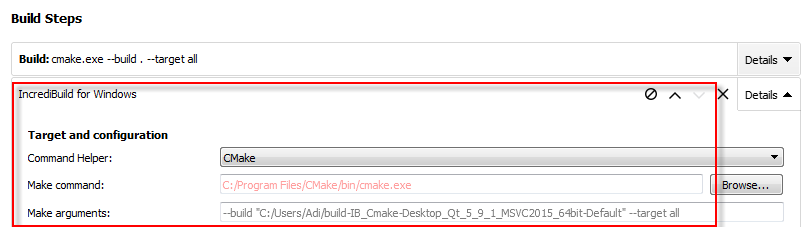 Likewise, in this example which uses CMake, upon adding the Incredibuild Build Step, the Build tool is automatically set to CMake.![]()