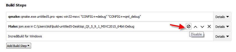 In order for your compilation to use the Incredibuild build step instead of your original build step the Incredibuild plugin will automatically disable your original build step. You can easily revert to executing your original build step by disabling the Incredibuild build step and re-enabling your original build step as shown in the image below.![]()