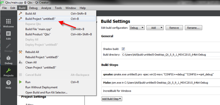 Once the Incredibuild plugin is installed, you will be able to add the "Incredibuild for Windows" or "Incredibuild for Linux" build steps to your Qt Creator from the Build Settings menu, which is accessed by clicking the Projects icon in Qt Creator. Upon adding an Incredibuild build step, Incredibuild will automatically detect the Build Step used in your build settings by iterating over the build steps you already defined. The initial build step settings will then be part of your Incredibuild build step, so your usual build tool will still be used, but with the added benefit of Incredibuild's build acceleration.