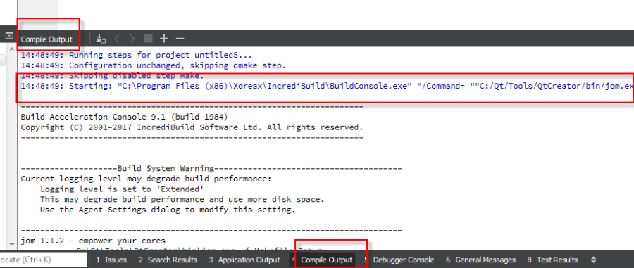 The output of the Incredibuild console will conveniently appear within your Qt Creator Compile Output console.![]()
