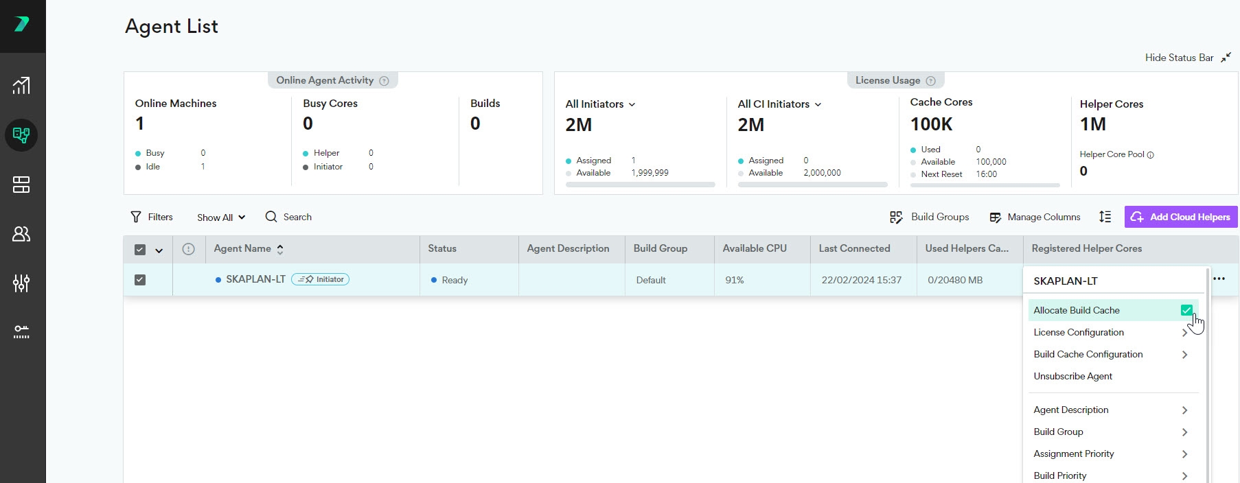 2. Click Actions >  Enable Build CacheAllocate Build Cache. If you do not see this option, make sure the agents have Initiator licenses.