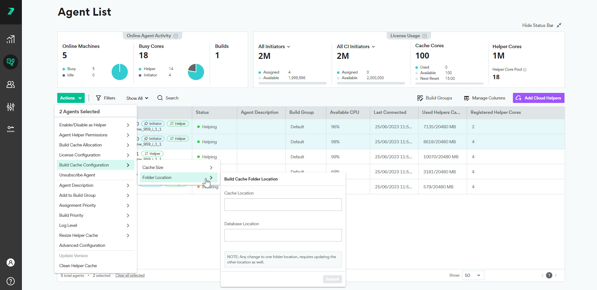 3. Click Actions >  Enable Build CacheAllocate Build Cache. If you do not see this option, make sure the agents have Initiator licenses.