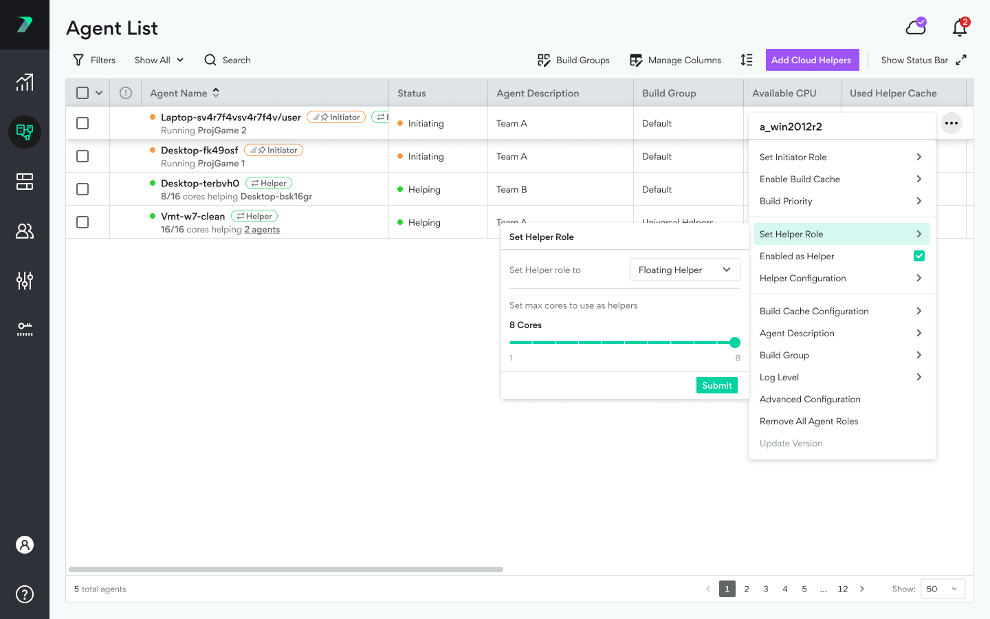 When setting the Helper role, you can define the max cores that each Helper can use. This settings can conflict with the similar settings in the Agent Settings > Agent > CPU Utilization area on each Agent machine. The setting in Coordinator Manager is primarily used by the grid manager to manage licenses. The Agent setting allows owners of Helper machines to limit their use. The lower value of the two settings will determine the maximum number of cores a particular Agent can use.