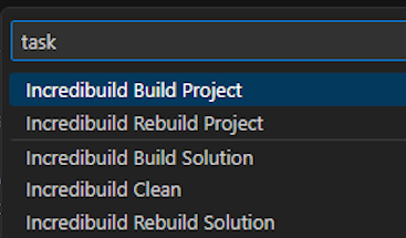 Type task in the search bar to display the list of build options from the Incredibuild tasks.json file such as Build Project, Rebuild Project, etc.