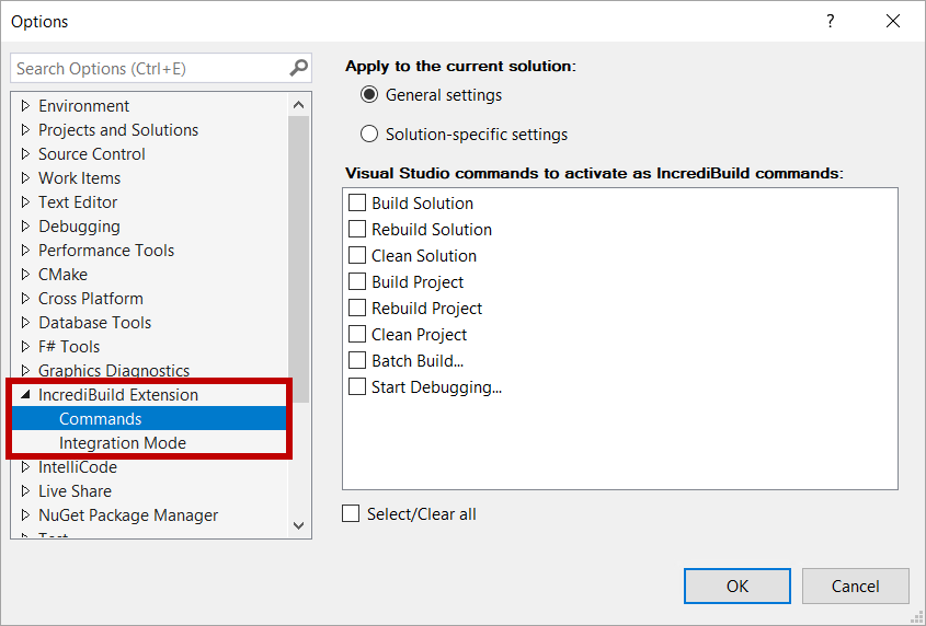 For SLN files, select General settings to assign the commands for all solutions, or select Solution-specific settings to assign the commands for the open solution. For CMake projects the commands are assigned for all solutions.