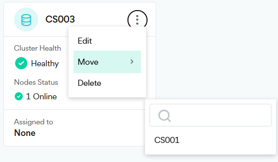 Select the target cluster name. In this example, the node from the CS003 cluster is moved to CS001.