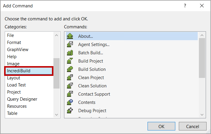 To add commands to the Incredibuild toolbar, click Add Command, select Incredibuild from the Categories list and then select the commands to add to the toolbar, and click OK.
