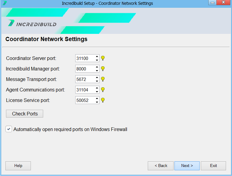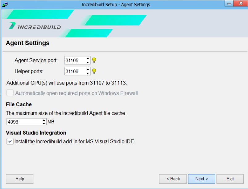 Helper ports: Enable the communication between the Initiator Agents in your IncrediBuild Environment and the installed Agent cores. Select the first port number to be used when the local machine contributes its idle cores to other machines that initiate tasks.