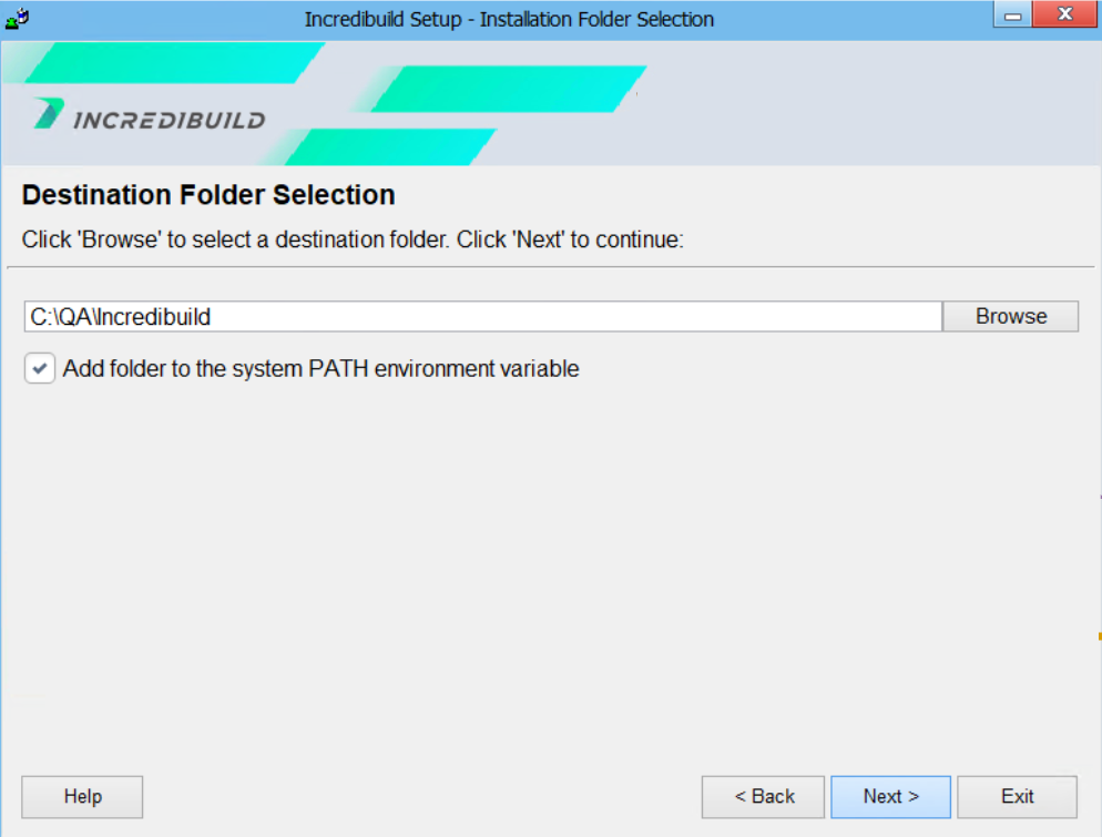 On the Destination Folder Selection page, select the installation folder. We recommend leaving Add folder to the system PATH environment variable checked as this ensure that there is a direct link from the CLI to Incredibuild tools, eliminating the need to specify the full path of their installation folder.