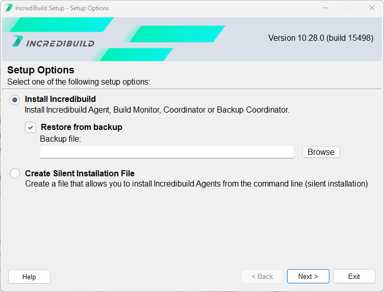 (Optional) If you want to restore from a backup file, select Restore from backup, and click Browse to select the required backup file. If you restore on the same machine there is no need to move licenses. If you restore to a different machine, the online licenses are moved automatically, but for an offline license, contact Incredibuild Customer Success/Support to reactivate the offline license.