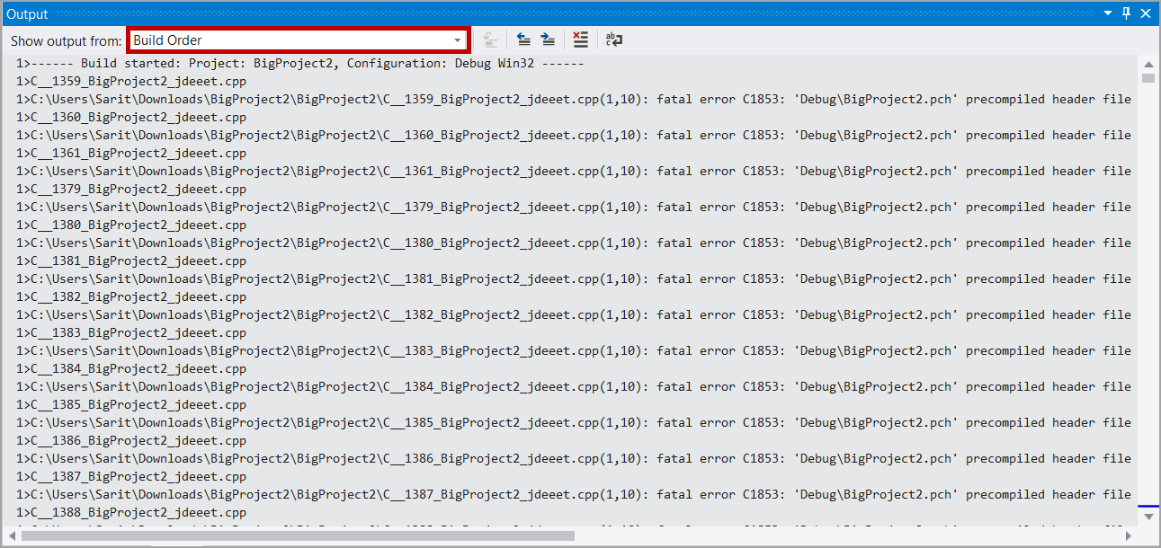 The Build Order view in Visual Studio Output window is displayed (instead of the Projects view in Internal mode):